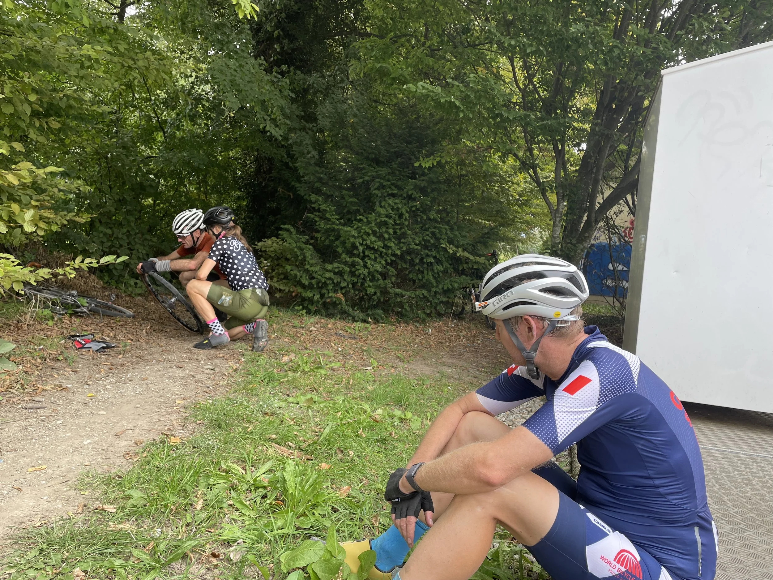 Jagoda laughs and turns back to the task in hand, helping Rich to try to somehow fix his tubeless tyre.