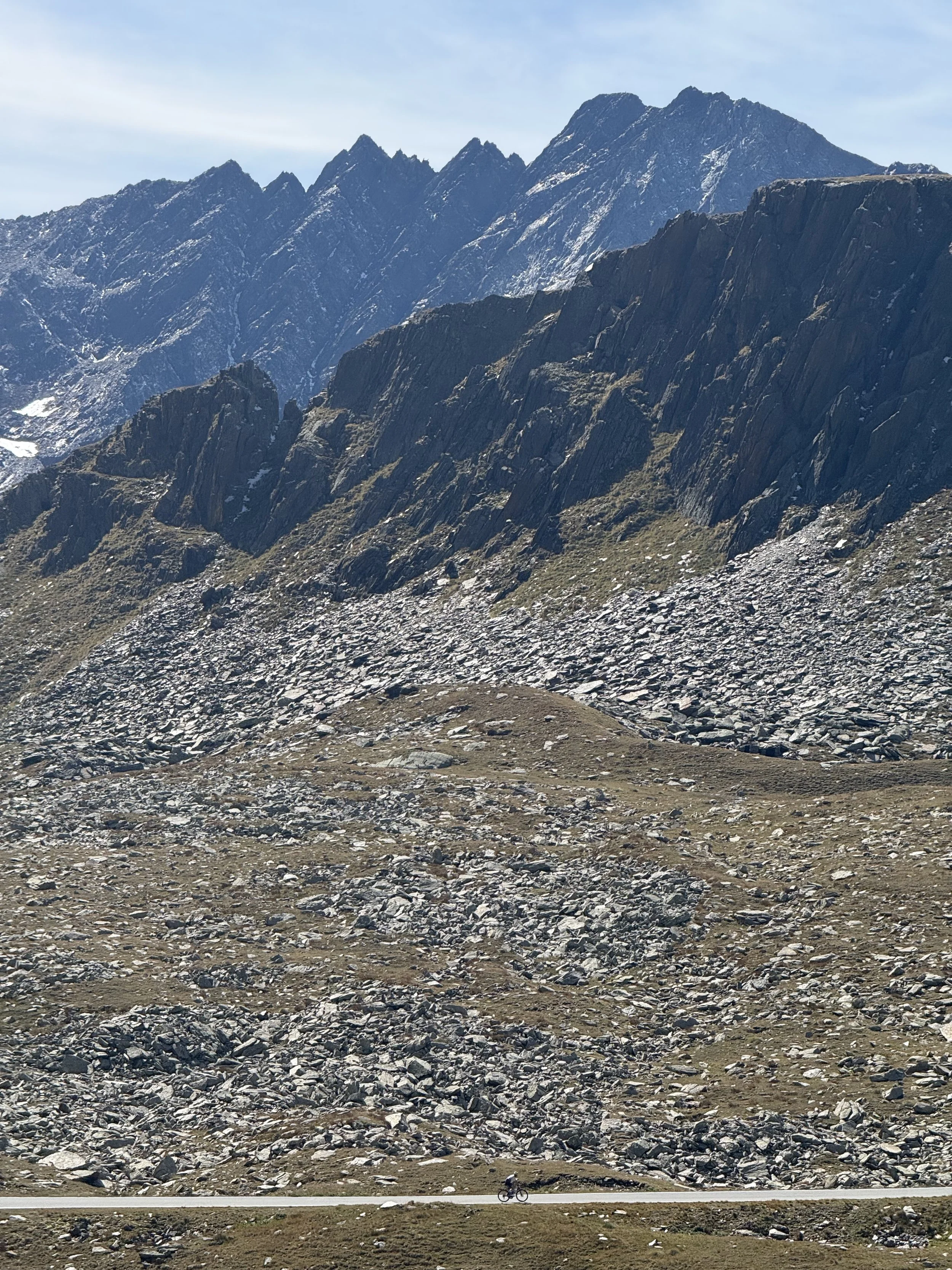 The descent down the Mortirolo is on a similar narrow “goat track”, and eventually leads to Ponte di Legno where the Gavia (The Lady of the Peaks) awaits. This final climb of the week is one to savour. It climbs through the larch and pine forests winding back and forth, before breaking out into stunning alpine slopes, with goats, sheep, horses and cows for company. Later the route leaves almost all life behind, and there are only the whistles of the marmottes for company. The climb tops out at 2618m and thankfully the refuge awaits with excellent cakes and coffee. You then descend all the way back to Bormio, 25km of bliss.