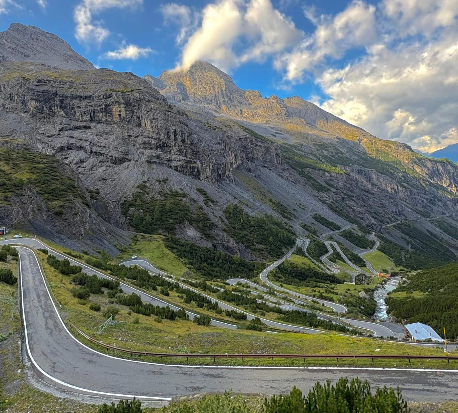 The legs had better be ready! We leave Bormio and almost immediately start climbing on the long road up to the Umbrail pass. Whilst the less “famous” side of the Stelvio, this climb has got everything - forested stretches, rock tunnels, steep pitches, fabulous hairpins, impressive waterfalls, and even a flattish section - all leading you up to the junction to the Umbrail Pass and the road to Switzerland.